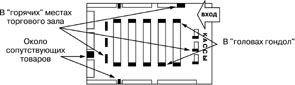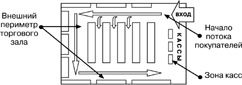 - 80-90% покупателей обходят все точки продаж, расположенные по периметру торгового зала, двигаясь против часовой стрелки; и только 40-50% посетителей обходят внутренние ряды. - Покупатели не любят начинать маршрут со средних рядов, они не любят возвращаться обратно и любят «срезать углы». - наиболее горячими областями при этом являются места начала потока покупателя и зоны касс /рис. 3/.