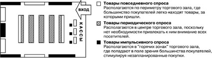 Сильные зоны: Правая сторона, Боковые полки стеллажей, Перекрестки “троп покупателей”, Выступы в стеллажахМеста, куда поку-патель “упирается взглядом” Слабые зоны:Левая сторона, Средние ряды, Тупики рядов, Углы торгового зала, Примыкающая к входу область Причем, пытливо-любознательное поведение покупателя у касс обусловлено тем, что он вынужден некоторое время проводить в ожидании очереди, и ничем в это время не занят. Поэтому, зона касс является максимально привлекательной для тех товаров, которые чаще других покупаются под воздействием импульса (жевательные резинки, сладости, напитки и т.д.) Также выгодно располагать в этой зоне газеты и журналы – покупатель может взять их для просмотра и затем купить. На следующей схеме /рис. 4/ приведено разделение товаров торговом зале по товарным группам: - Товары повседневного спроса. Покупка этих товаров является целью практически каждого визита покупателя в торговую точку. Их часто называют магазинообразующими товарными группами. - Товары периодического спроса. Покупка этих товаров планируется один раз в несколько визитов. - Товары импульсного спроса. Покупка этих товаров обычно не планируется.