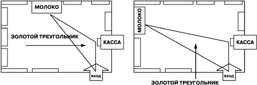 Поскольку товары повседневного спроса востребованы наибольшим числом посетителей, около данных точек продажи скапливается достаточно большое количество покупателей. Поэтому, данные товарные категории должны располагаться по внешнему периметру торгового зала, чтобы сделать покупку удобней. Для компактных торговых залов весьма иллюстративно правило «золотого треугольника» /рис. 5/. Суть в том, что товар, которым мы хотим заинтересовать покупателя, должен находиться в «золотом треугольнике» – площади расположенной между входной дверью, кассой и самым ходовым товаром в магазине.