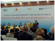 Với sự tham gia của đông đảo đại diện cộng đồng doanh nghiệp (DN) Việt Nam và DN các nước EAEU, Diễn đàn nhằm thông tin rộng rãi hơn về những cơ hội, lợi ích của Hiệp định thương mại tự do song phương vừa ký kết hồi tháng 5 vừa qua. Phát biểu tại Diễn đàn, Thứ trưởng Bộ Công Thương Hoàng Quốc Vượng nhận định, quan hệ thương mại giữa Việt Nam và các nước Liên minh Kinh tế Á – Âu luôn tăng trưởng khả quan qua các năm. Trong giai đoạn 2009-2014, thương mại hai chiều tăng trưởng bình quân 5-6% với kim ngạch song phương đạt 4,2 tỉ USD vào năm 2014. Tuy nhiên, đây là con số hạn chế so với tiềm năng hợp tác của hai bên. Hiệp định thương mại tự do song phương sẽ là khuôn khổ giúp cộng đồng DN hai bên tăng cường hợp tác, phát triển. Với việc Chủ tịch nước CHXHCN Việt Nam đã phê duyệt Hiệp định vào ngày 19/8/2015, trong thời gian tới, các cơ quan chức năng Việt Nam và Liên minh Kinh tế Á - Âu cần nỗ lực đẩy nhanh tiến trình tổ chức thực hiện Hiệp định; phối hợp tuyên truyền, thông tin rộng khắp về nội dung Hiệp định đối với DN, nhân dân hai bên. Đồng thời, khuyến khích tạo điều kiện thuận lợi cho DN hai bên tham gia đầu tư, kinh doanh tại địa bàn và tăng cường giao thương DN, hàng hóa song phương. Trong khi đó, theo Thứ trưởng thứ nhất Bộ Phát triển kinh tế Nga A.Likhachev, với việc gần đây, Cộng đồng Kinh tế Asean chính thức được thành lập, Việt Nam trở thành cầu nối quan trọng kết nối hợp tác kinh tế, giao thương giữa khối Asean thống nhất với Liên minh Kinh tế Á – Âu. Theo Vụ Thị trường châu Âu (Bộ Công Thương), FTA song phương là Hiệp định quan trọng, mang lại nhiều lợi ích cho cộng đồng DN hai bên. Ngay sai khi Hiệp định có hiệu lực, gần 90% dòng thuế của hai bên sẽ được cắt, giảm về 0%, tương đương 90% kim ngạch thương mại song phương hiện nay. Trong đó, Việt Nam đồng ý cắt giảm thuế quan đối với 87,7% tổng số dòng thuế, tương đương với 94,4% tổng kim ngạch nhập khẩu của Việt Nam từ Liên minh Kinh tế Á – Âu, trong đó tỷ lệ xóa bỏ thuế quan ngay là 52,4%. Về phần mình, Liên minh cam kết mở cửa thị trường ở các mức độ khác nhau đối với 87,4% tổng số dòng thuế, tương đương 90,5% tổng kim ngạch nhập khẩu trung bình từ Việt Nam trong 3 năm từ 2010 đến 2012. Trong đó, 84,7% số dòng thuế được cam kết xóa bỏ thuế hoàn toàn theo lộ trình, tối đa trong 10 năm, 2,7% số dòng thuế mở cửa một phần. Tại Diễn đàn, các DN hai bên đã tập trung kiến nghị, nêu ý kiến đối với những vướng mắc cần tháo gỡ trong khâu thanh toán song phương, các yêu cầu cần chú ý đối với chất lượng một số loại hàng hóa như thực phẩm, thủy hải sản, công tác tuyên truyền, phổ biến những vấn đề trong FTA đối với các đối tác liên quan... Ban tổ chức cũng thiết lập các cuộc gặp gỡ, trao đổi ngắn để các đối tác đầu tư, DN cùng lĩnh vực hoặc cùng quan tâm tiếp xúc, giới thiệu, tiến tới thiết lập quan hệ hợp tác làm ăn, giao thương.
