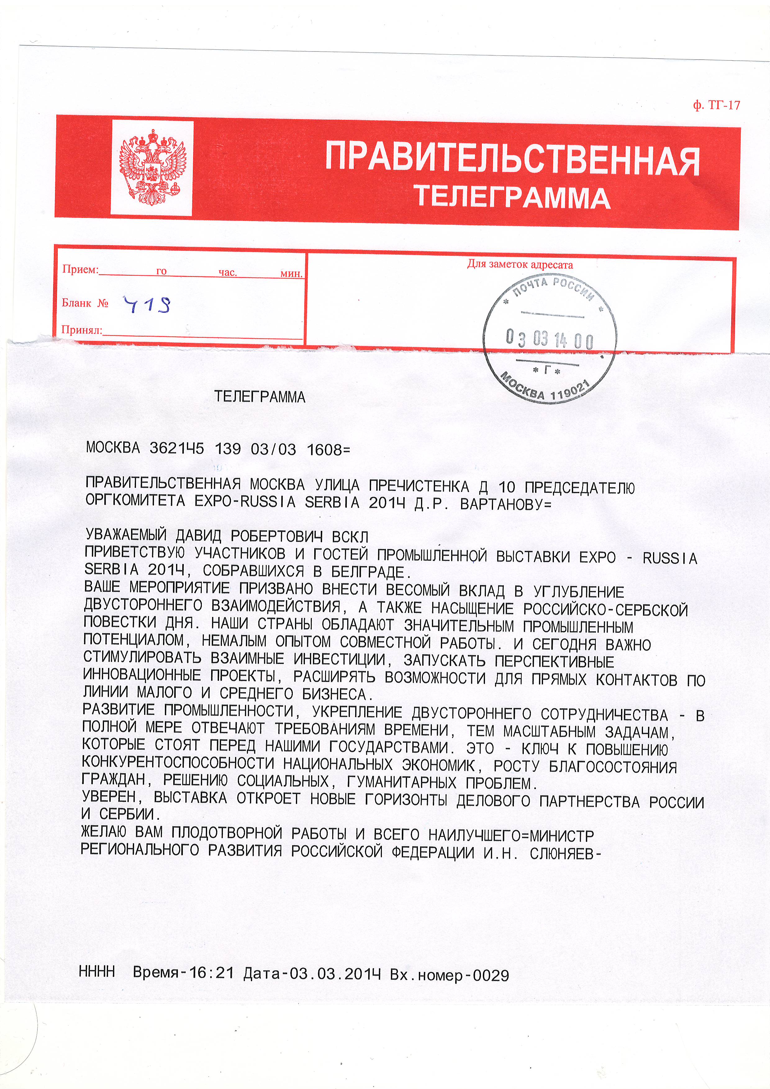 ПРИВЕТСВУЮ УЧАСТНИКОВ И ГОСТЕЙ ПРОМЫШЛЕННОЙ ВЫСТАВКИ EXPO–RUSSIA SERBIA 2014, СОБРАВШИХСЯ В БЕЛГРАДЕ.